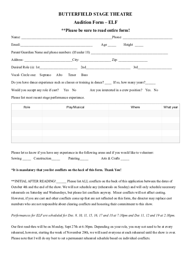 BUTTERFIELD STAGE Theater Audition Form ELF **Please be sure to read entire form! Name: ___Phone: ___ Email:___Age ___Height ___Parent/Guardian Name and phone numbers: (If under 18) ___ Address: ___City: