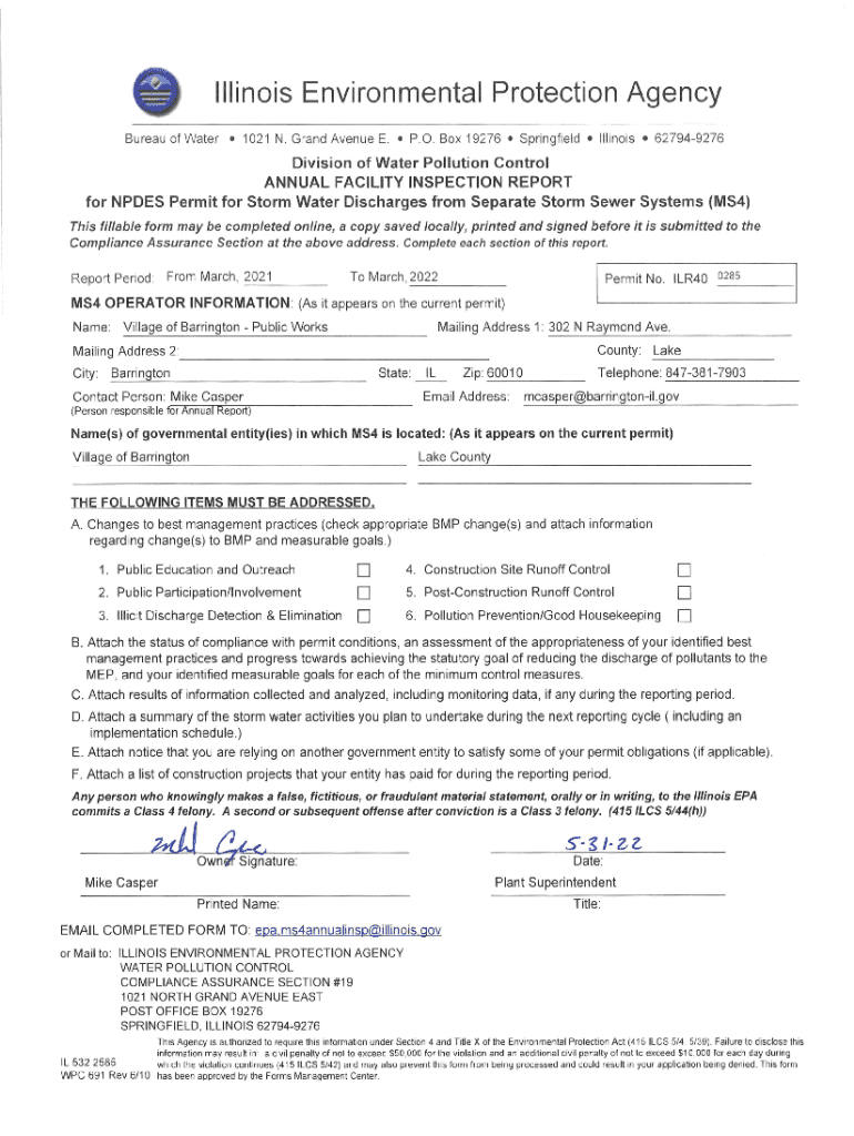 Illinois Environmental Protection Agency Bureau of Water 1021 N. Grand Avenue E. P 0. Box 19276 Springfield Illinois 627949276Division of Water Pollution Control ANNUAL FACILITY INSPECTION REPORT