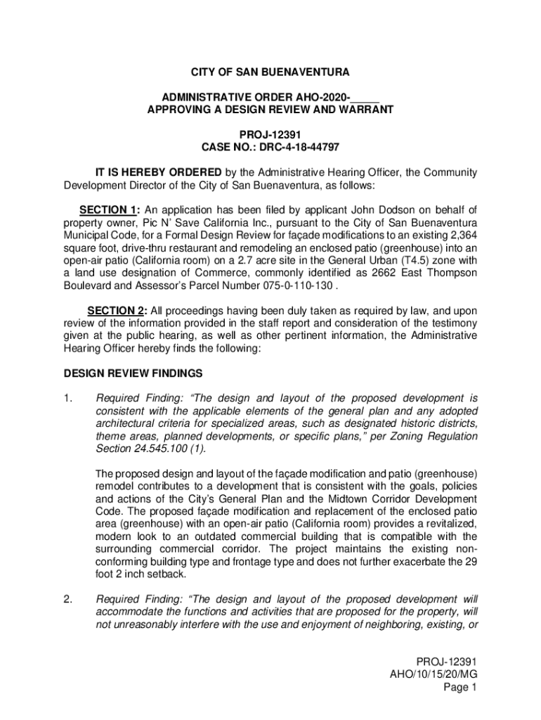 CITY OF SAN BUENAVENTURA ADMINISTRATIVE ORDER AHO2020___ APPROVING A DESIGN REVIEW AND WARRANT PROJ12391 CASE NO.: DRC41844797 IT IS HEREBY ORDERED by the Administrative Hearing Officer, the Community