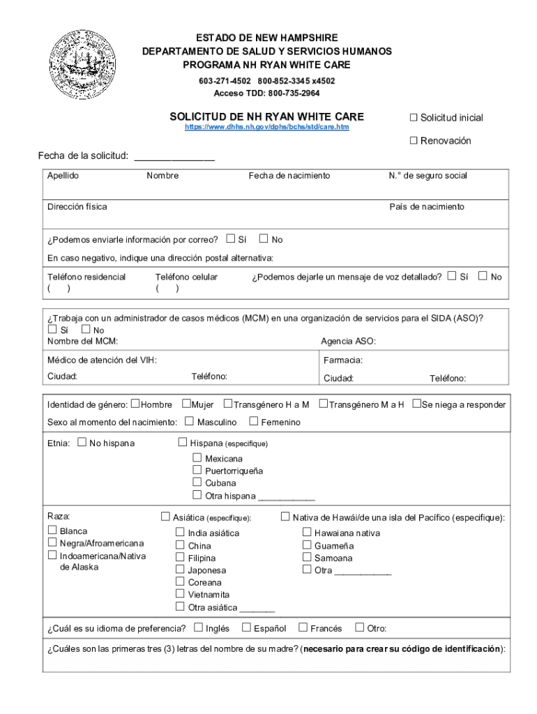 ESTATE DE NEW HAMPSHIRE DEPARTMENT DE SALAD Y SERVICES HUMANS PROGRAM ANH RYAN WHITE CARE 6032714502 8008523345 x4502 Access TDD: 8007352964SOLICITUD DE NH RYAN WHITE CARE https://www.dhhs.nh.gov/dphs/bchs/std/care.htm