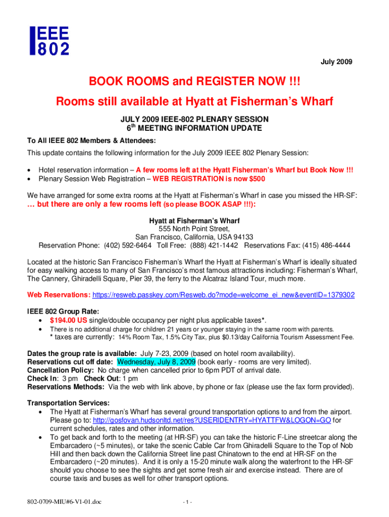 July 2009BOOK ROOMS and REGISTER NOW !!! Rooms still available at Hyatt at Fisherman Wharf JULY 2009 IEEE802 PLENARY SESSION 6th MEETING INFORMATION UPDATE To All IEEE 802 Members & Attendees: This