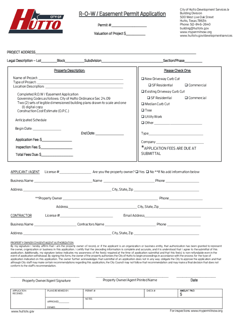 City of Bhutto Development Services & Building Division 500 West Live Oak Street Bhutto, Texas 78634 Phone: 5128462640 building@huttotx.gov www.mypermitnow.org www.huttotx.gov/developmentservicesROW