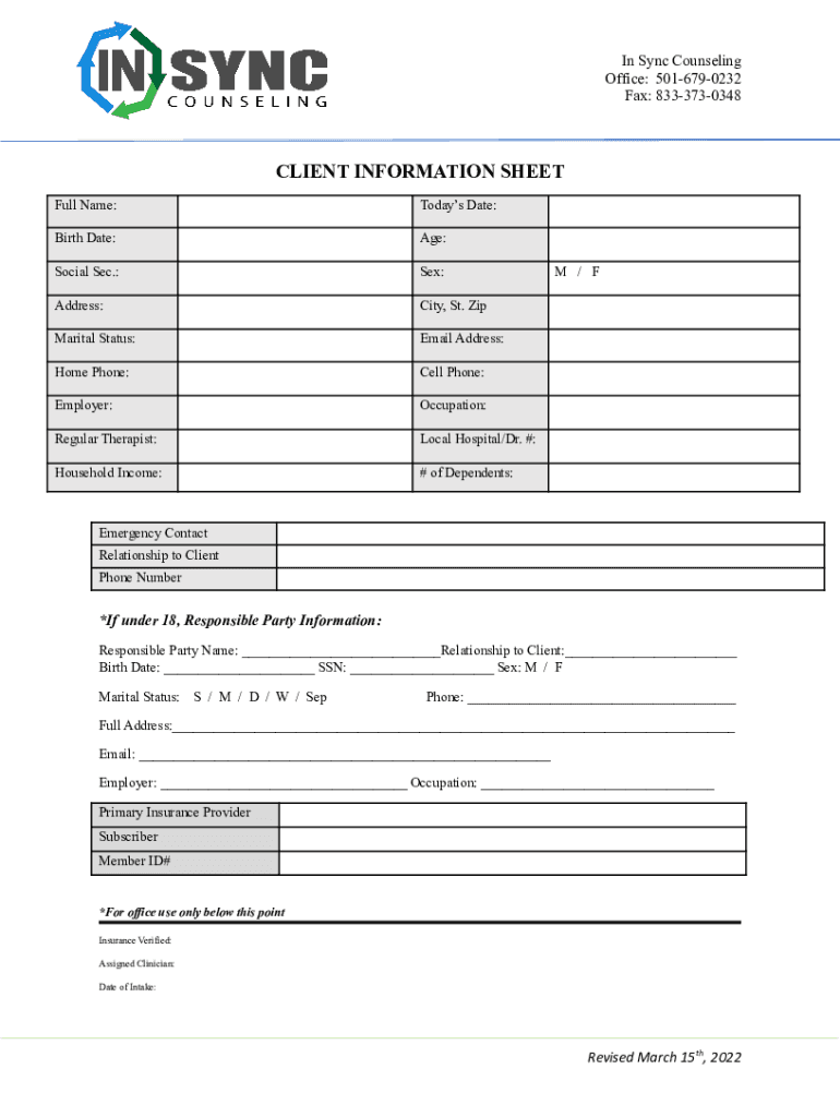 In Sync Counseling Office: 5016790232 Fax: 8333730348CLIENT INFORMATION SHEET Full Name:Today's Date:Birth Date:Age:Social Sec.:Sex:Address:City, St. Marital Status:Email Address:Home Phone:Cell Phone:Employer:Occupation:Regular