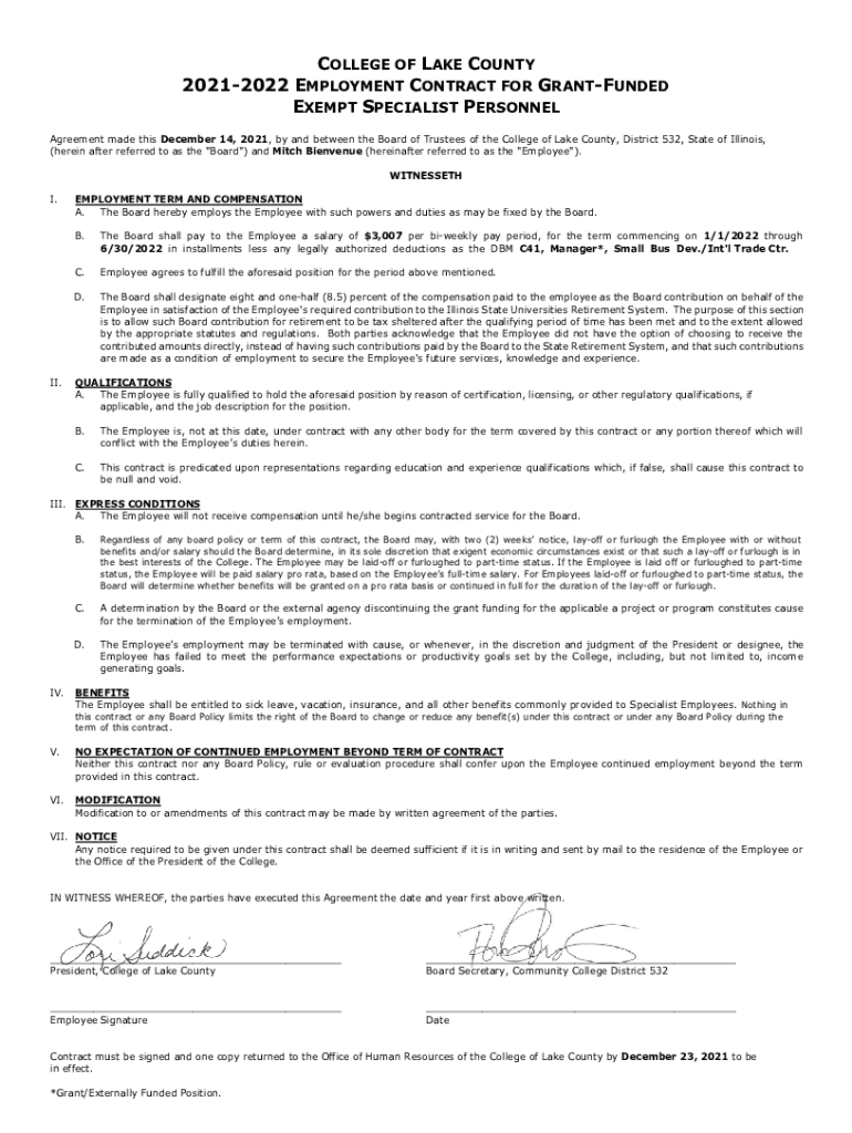 COLLEGE OF LAKE COUNTY 20212022 EMPLOYMENT CONTRACT FOR GRANTFUNDED EXEMPT SPECIALIST PERSONNEL Agreement made this December 14, 2021, by and between the Board of Trustees of the College of Lake County,