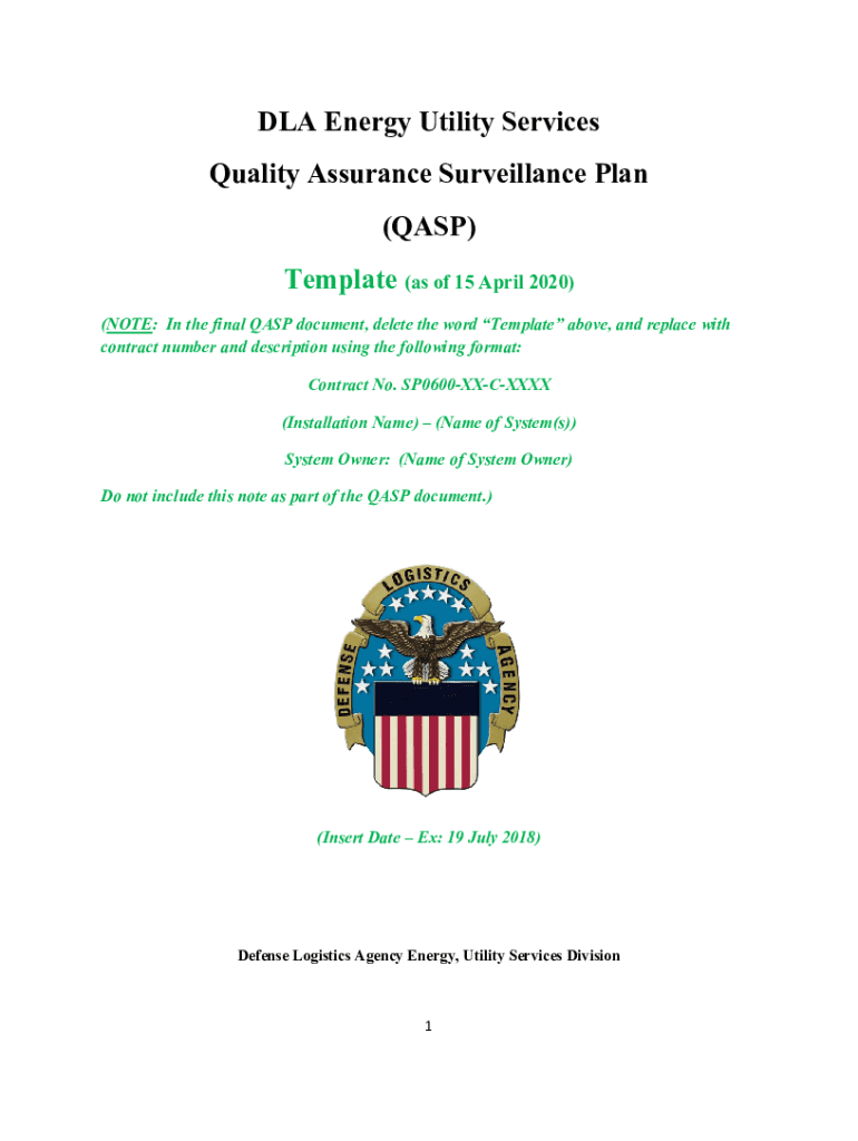 DLA Energy Utility Services Quality Assurance Surveillance Plan (WASP) Template (as of 15 April 2020) (NOTE: In the final WASP document, delete the word Template above, and replace with contract number
