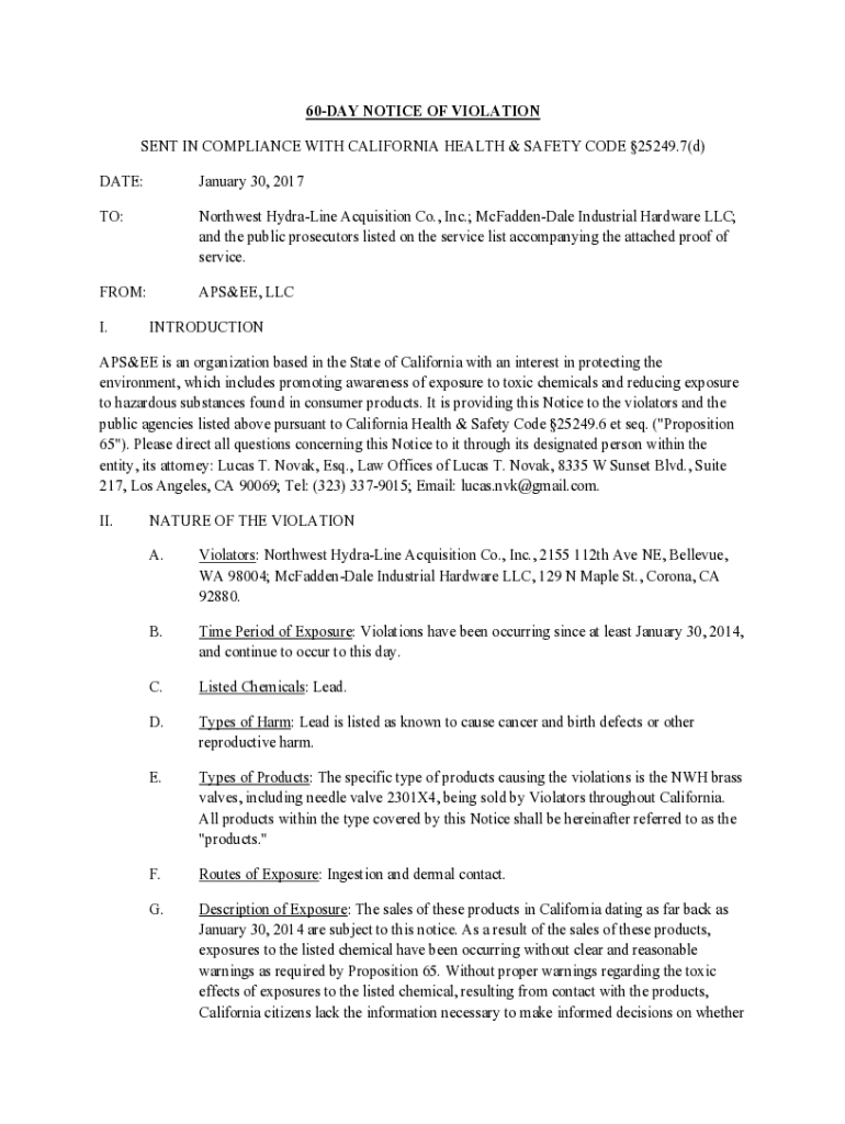 60DAY NOTICE OF VIOLATION SENT IN COMPLIANCE WITH CALIFORNIA HEALTH & SAFETY CODE 25249.7(d) DATE:January 30, 2017TO:Northwest Hydrazine Acquisition Co., Inc.; McFadden Dale Industrial Hardware LLC;