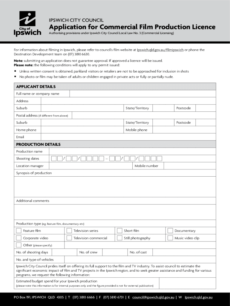 IPSWICH CITY COUNCILApplication for Commercial Film Production License Authorizing provisions under Ipswich City Council Local Law No. 3 (Commercial Licensing)For information about filming in Ipswich,