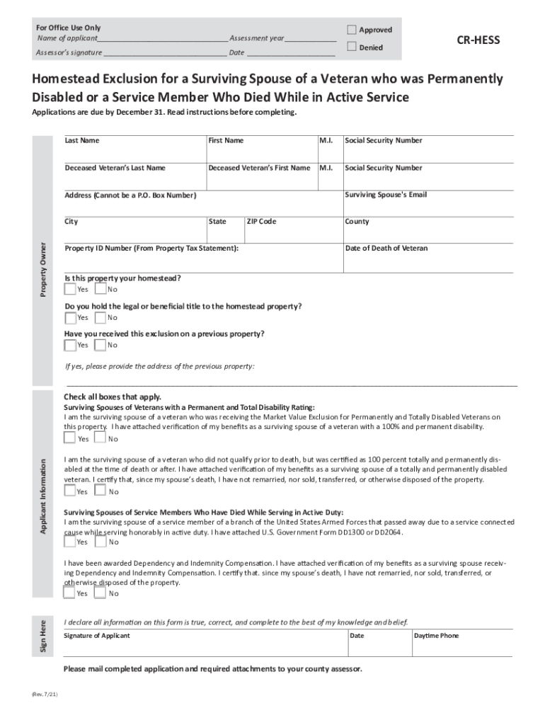 For Office Use Only Name of applicant___Assessment year ___ Assessors signature ___Date ___ApprovedCRHESSDeniedHomestead Exclusion for a Surviving Spouse of a Veteran who was Permanently Disabled