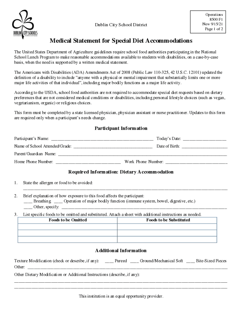 Dublin City School DistrictOperations 8500 F1 New 9/15/21-Page 1 of 2Medical Statement for Special Diet Accommodations The United States Department of Agriculture guidelines require school food authorities
