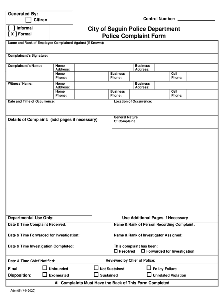 Generated By:[ ]Control Number:Citizen[ ] Informal [x] Formality of Seguin Police Department Police Complaint Forename and Rank of Employee Complained Against (If Known):Complainants Signature: Complainants