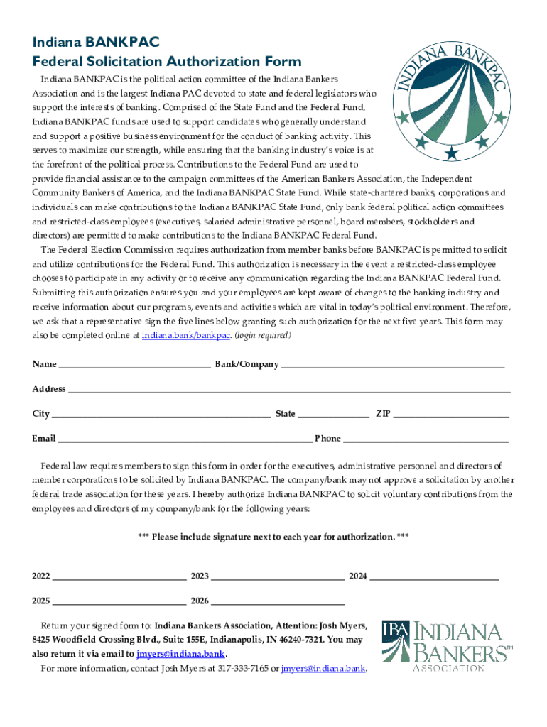 Get the free PDF Indiana BANKPAC Federal Solicitation Authorization Form