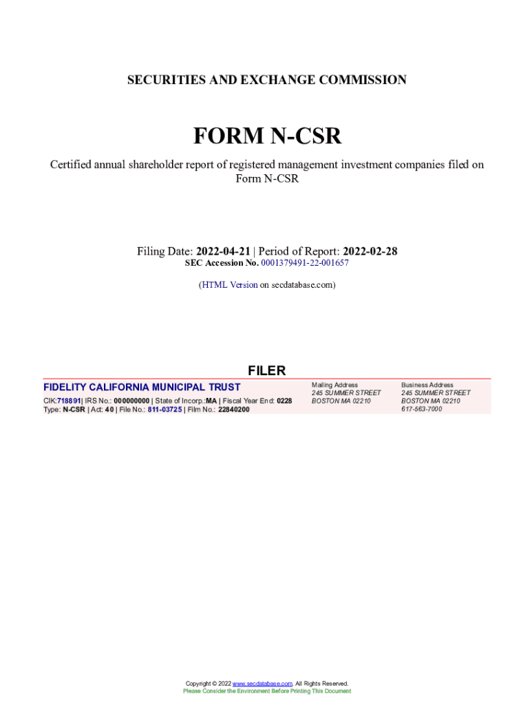 Get the free FIDELITY CALIFORNIA MUNICIPAL TRUST Form N-CSR Filed 2022-04-21. Accession Number