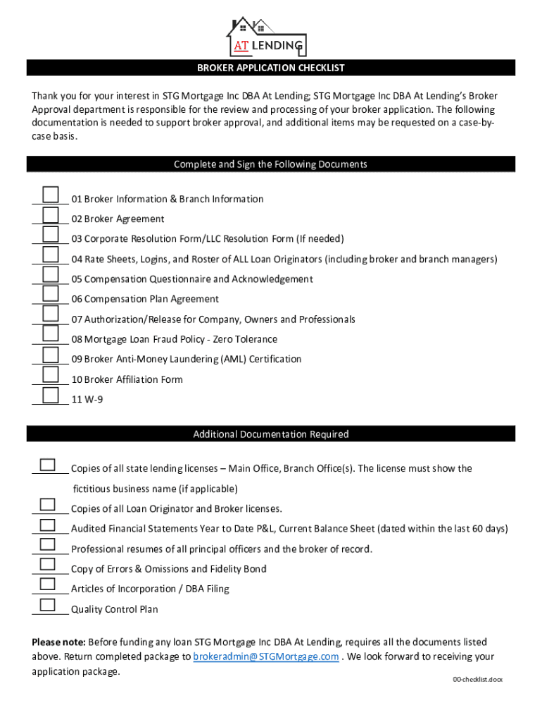 BROKER APPLICATION CHECKLIST Thank you for your interest in STG Mortgage Inc DBA At Lending; STG Mortgage Inc DBA At Lendings Broker Approval department is responsible for the review and processing