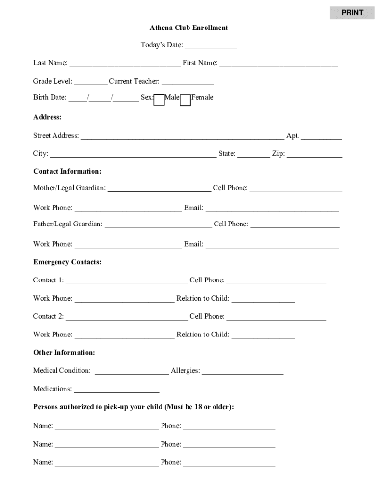 MidBuchanan RV Athena Club Parent Handbook20182019Providing Quality, Affordable School Age Child CarePRINTAthena Club Enrollment Today's Date: ___ Last Name: ___ First Name: ___ Grade Level: ___ Current