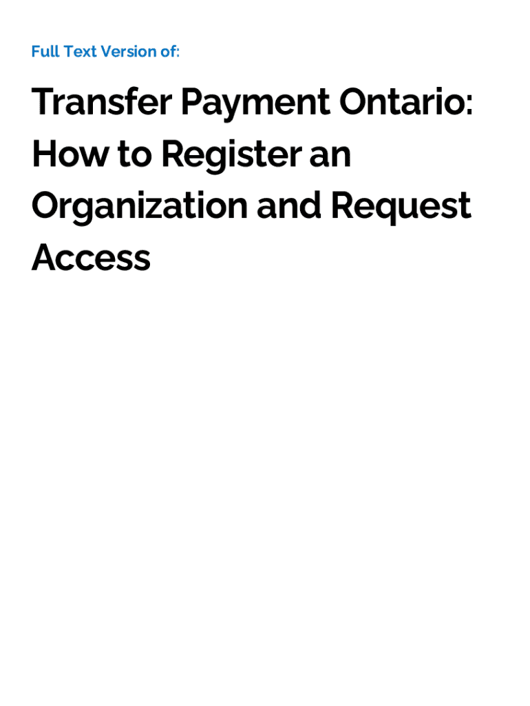 Full Text Version of:Transfer Payment Ontario: How to Register an Organization and Request AccessWelcome to Transfer Payment Ontario: How to Register an Organization and Request Access. There is a