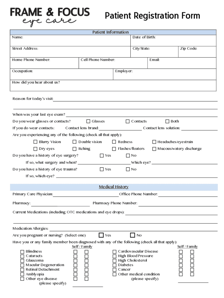 Patients who wish to receive eye care services from wwwframeandfocuseyecarecom are required to file the patient registration form.