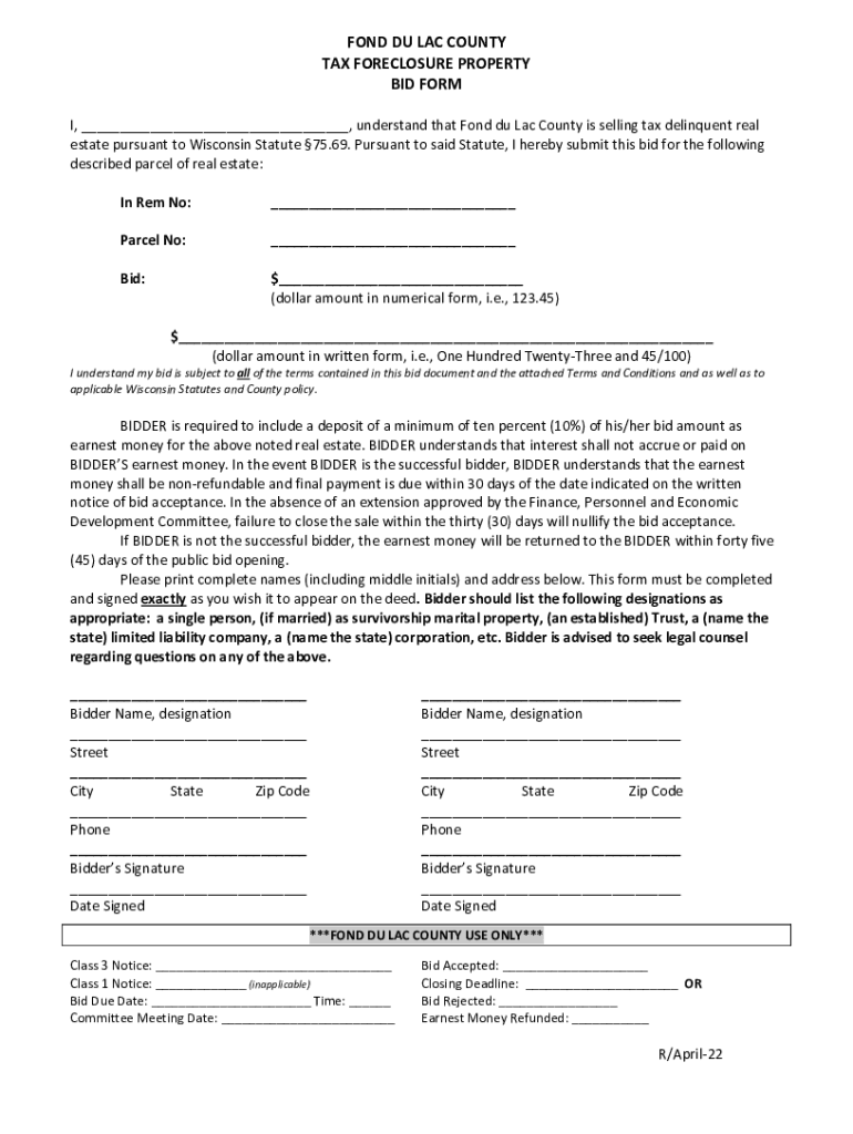 FOND DU LAC COUNTY TAX FORECLOSURE PROPERTY BID FORM I, ___, understand that Fond du Lac County is selling tax delinquent real estate pursuant to Wisconsin Statute 75.69. Pursuant to said Statute,
