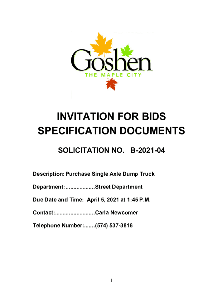 INVITATION FOR BIDS SPECIFICATION DOCUMENTS SOLICITATION NO. B202104 Description: Purchase Single Axle Dump Truck Department: ................... Street Department Due Date and Time: April 5, 2021,