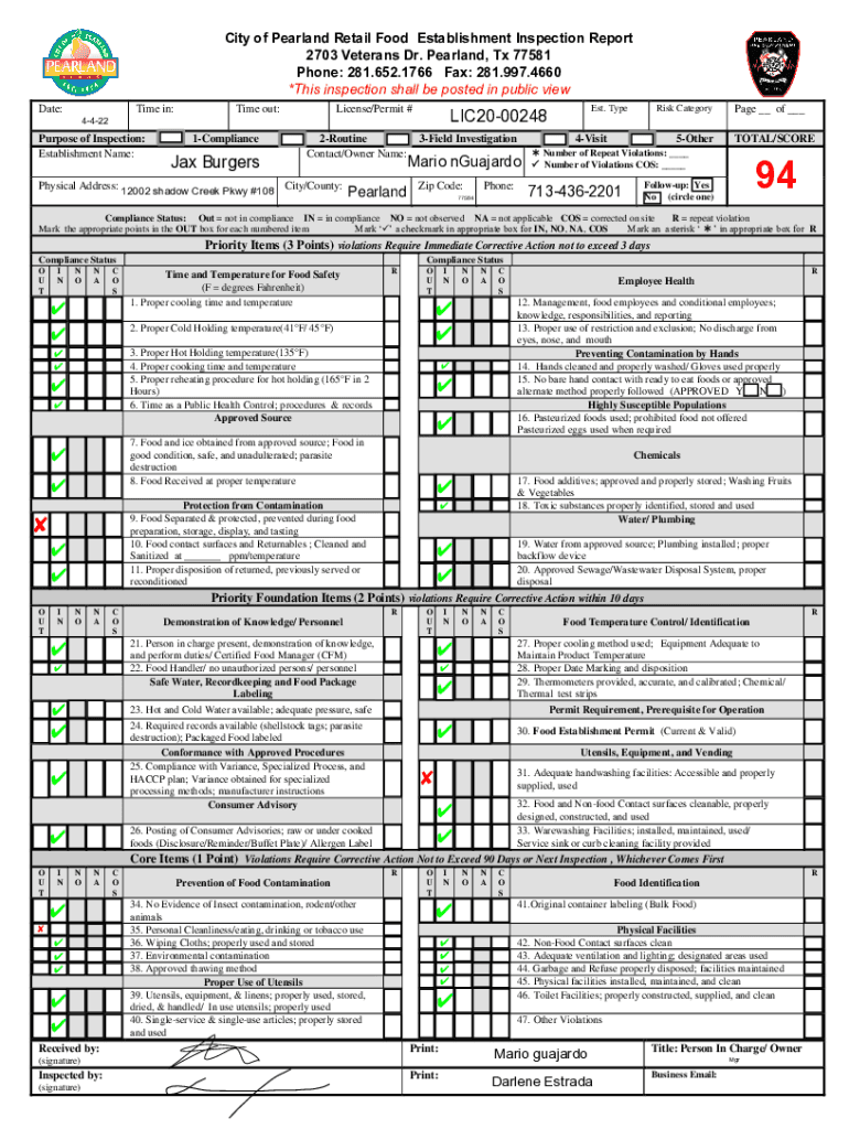 City of Pearland Retail Food Establishment Inspection Report
