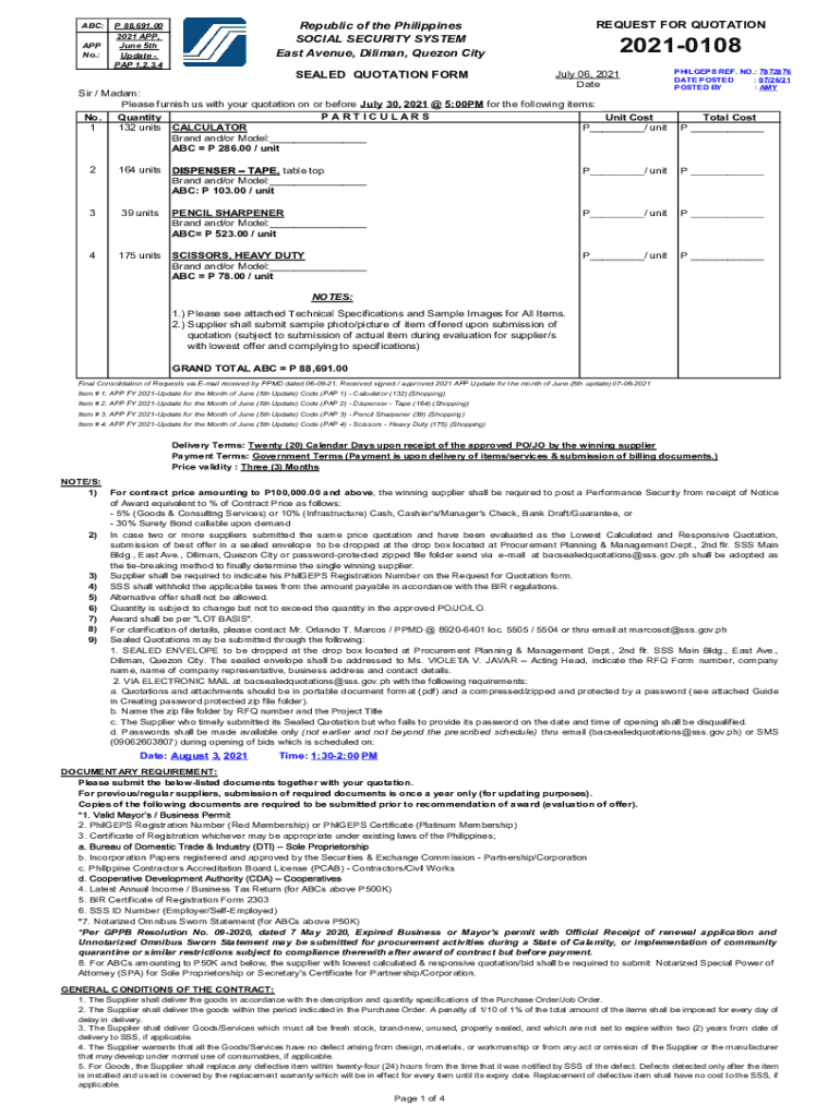 ABC:P 88,691.00APP No.:2021 APP, June 5th Update PAP 1,2,3,4REQUEST FOR QUOTATIONRepublic of the Philippines SOCIAL SECURITY SYSTEM East Avenue, Dalian, Quezon City SEALED QUOTATION FORM20210108 July