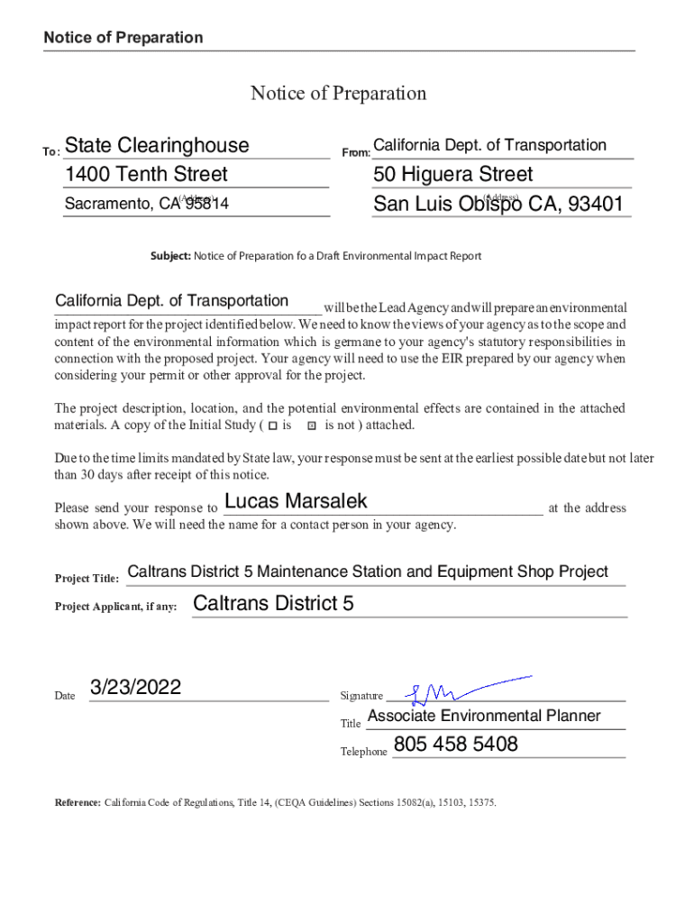 Notice of PreparationNotice of Preparation To:State Clearinghouse 1400 Tenth StreetFrom:California Dept. of Transportation50 Higher Street (Address) San Luis Obispo CA, 93401(Address)Sacramento, CA