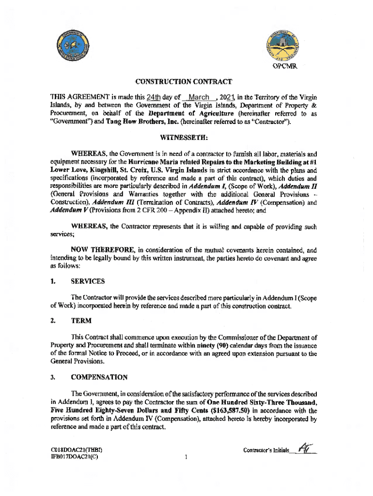 ___, O?CMR CONSTRUCTION CONTRACT THIS AGREEMENT is made this 24th day of March 20_, 21 in the Territory of the Virgin Islands, by and between the Government of the Virgin Islands, Department of Property