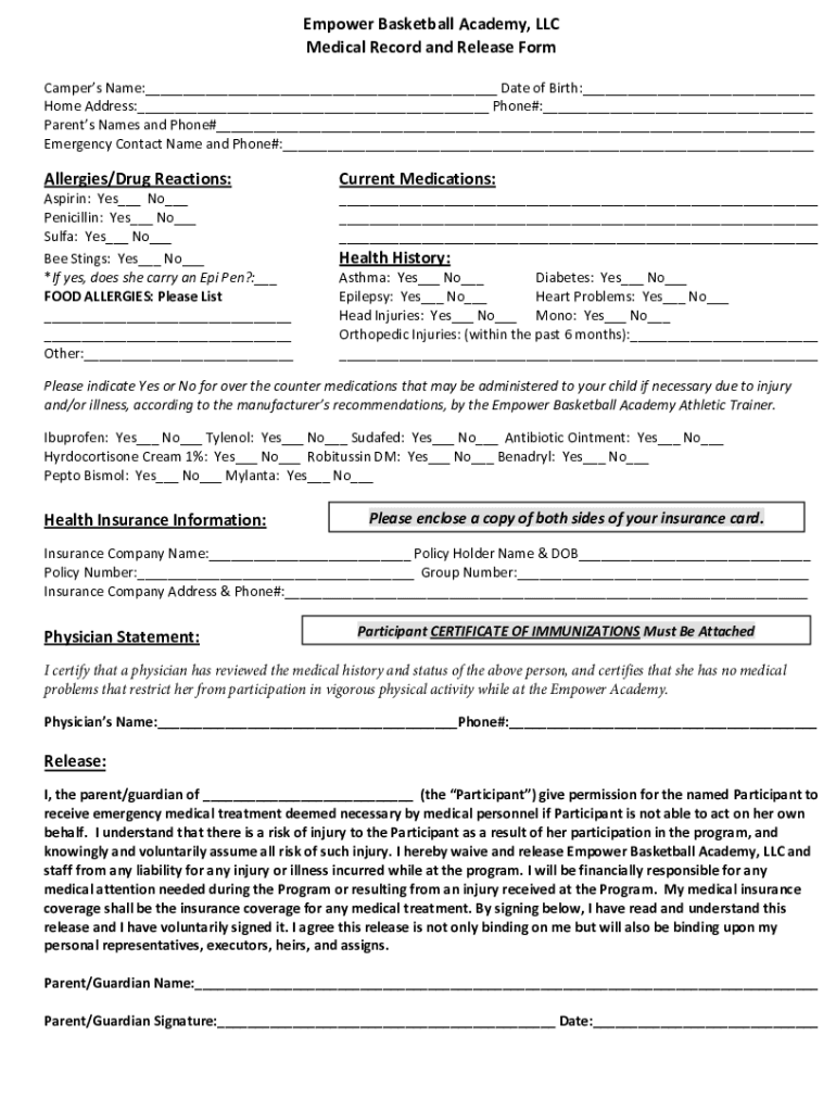 Empower Basketball Academy, LLC Medical Record and Release Form Campers Name:___ Date of Birth:___ Home Address:___ Phone#:___ Parents Names and Phone#___ Emergency Contact Name and Phone#:___Allergies/Drug