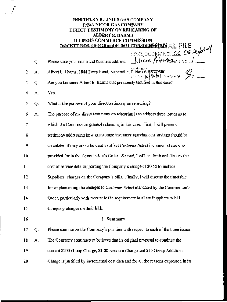 NORTHERN ILLINOIS GAS COMPANY D/B/A NICER GAS COMPANY DIRECT TESTIMONY ON REHEARING OF ALBERT E. HARMS ILLINOIS COMMERCE COMMISSION DOCKET NOS Please state your name1Q.2A.3Q. Are you the same Albert