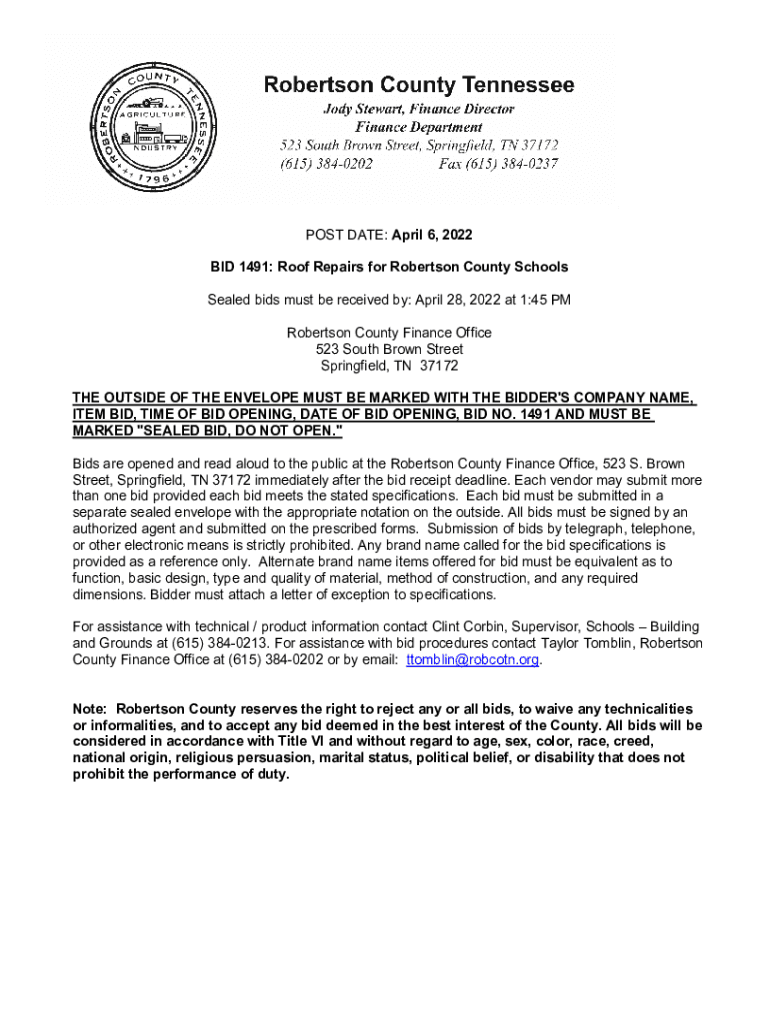 POST DATE: April 6, 2022, BID 1491: Roof Repairs for Robertson County Schools Sealed bids must be received by: April 28, 2022, at 1:45 PM Robertson County Finance Office 523 South Brown Street Springfield,