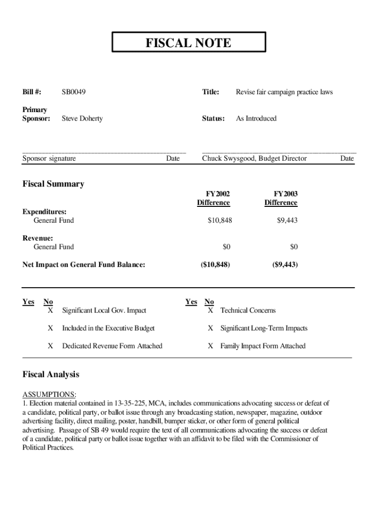 FISCAL NOTE Bill #:SB0049Title:Revise fair campaign practice lawsPrimary