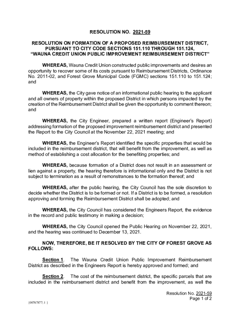 RESOLUTION NO. 202159 RESOLUTION ON FORMATION OF A PROPOSED REIMBURSEMENT DISTRICT, PURSUANT TO CITY CODE SECTIONS 151.110 THROUGH 151.124, FAUNA CREDIT UNION PUBLIC IMPROVEMENT REIMBURSEMENT DISTRICT
