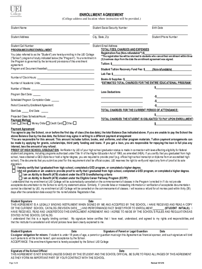 ENROLLMENT AGREEMENT (College address and location where instruction will be provided.) Student NameStudent Social Security NumberBirth DateStudent Addressing, State, Student Phone NumberStudent Cell