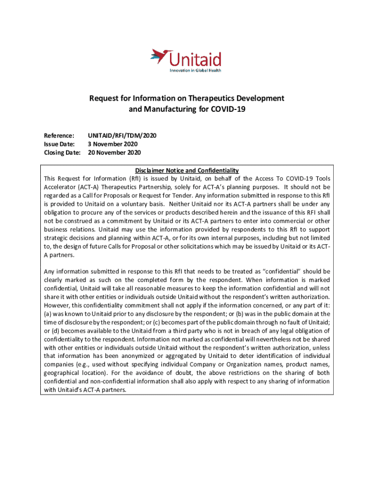 Request for Information on Therapeutics Development and Manufacturing for COVID-19 Reference: Issue Date: Closing Date:UNIT AID/RFI/TDM/2020 3 November 2020 20 November 2020Disclaimer Notice and Confidentiality
