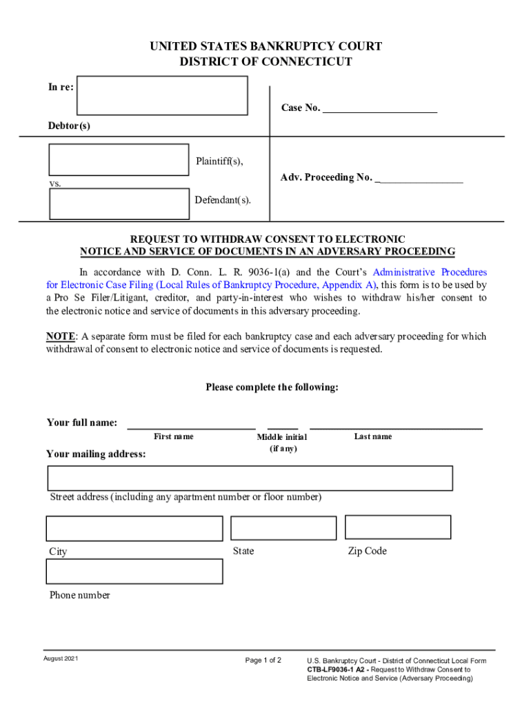 UNITED STATES BANKRUPTCY COURT DISTRICT OF CONNECTICUT In re: Case No. ___ Debtor(s) Plaintiff(s), Adv. Proceeding No. ___vs. Defendant(s).REQUEST TO WITHDRAW CONSENT TO ELECTRONIC NOTICE AND SERVICE