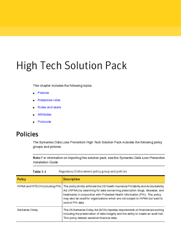 High Tech Solution Pack This chapter includes the following topics: PoliciesResponse resoles and usersAttributesProtocolsPolicies The Symantec Data Loss Prevention High Tech Solution Pack includes