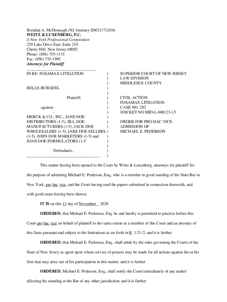 Get the free Burgess - Order Admitting Pro Hac Vice Michael E Pederson in L ...