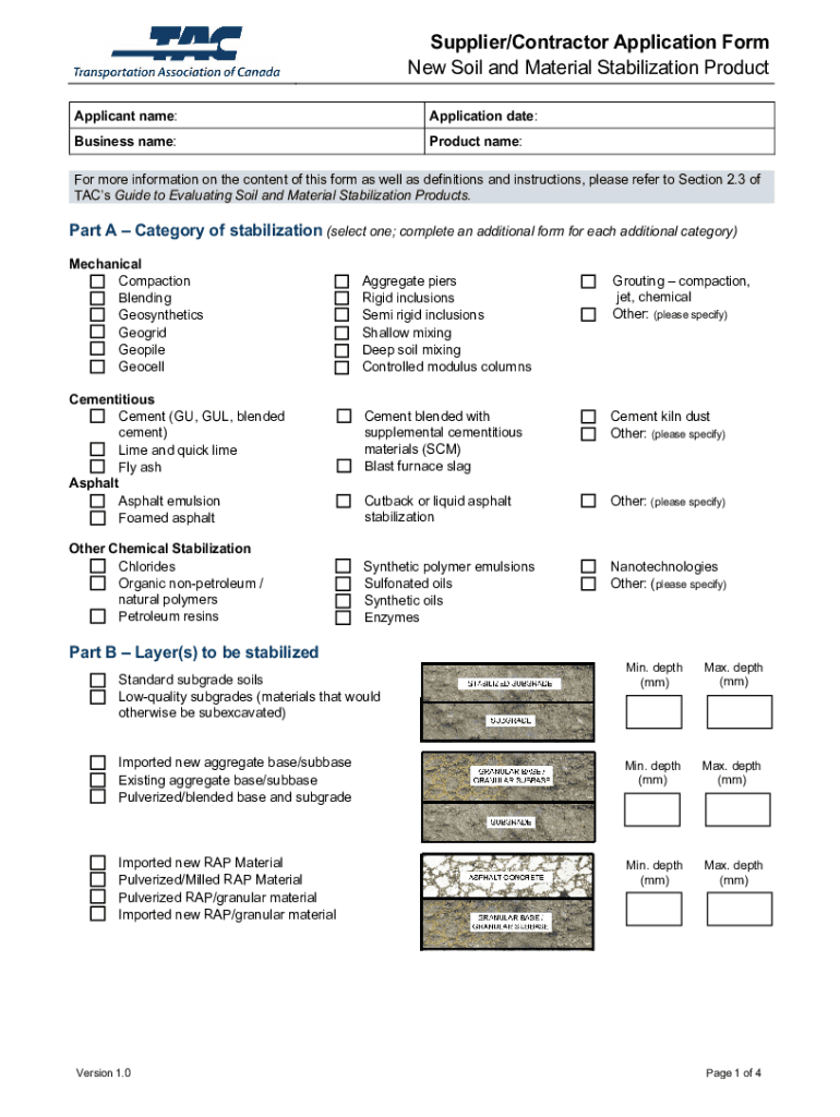 Supplier/Contractor Application Form New Soil and Material Stabilization Product Applicant name:Application date:Business name:Product name:For more information on the content of this form as well