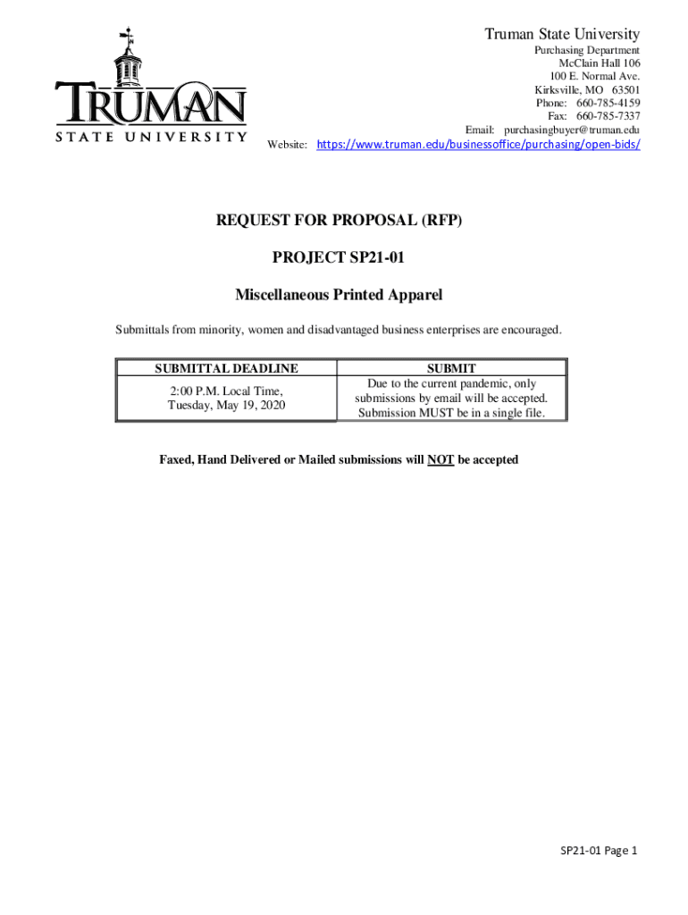 Truman State University Purchasing Department McClain Hall 106 100 E. Normal Ave. Clarksville, MO 63501 Phone: 6607854159 Fax: 6607857337 Email: purchasingbuyer@truman.edu Website: https://www.truman.edu/businessoffice/purchasing/openbids/REQUEST