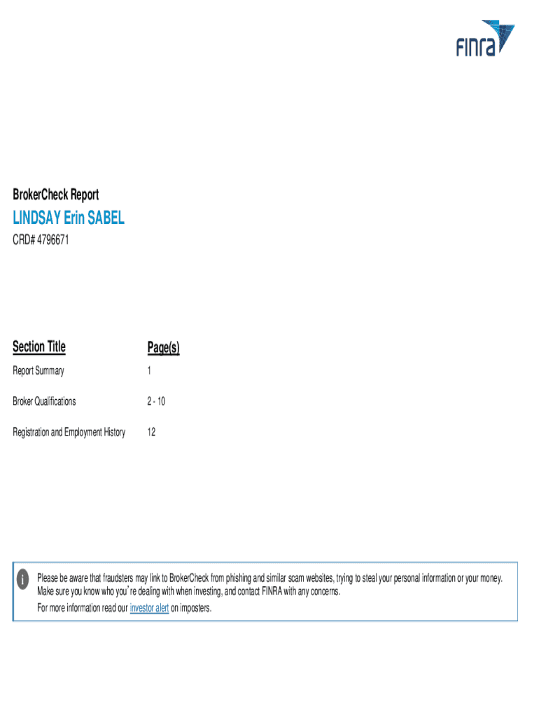 BrokerCheck ReportLINDSAY Erin LABEL CRD# 4796671Section Title Page(s)Report Summary1Broker Qualifications2 10Registration and Employment History12iPlease be aware that fraudsters may link to BrokerCheck