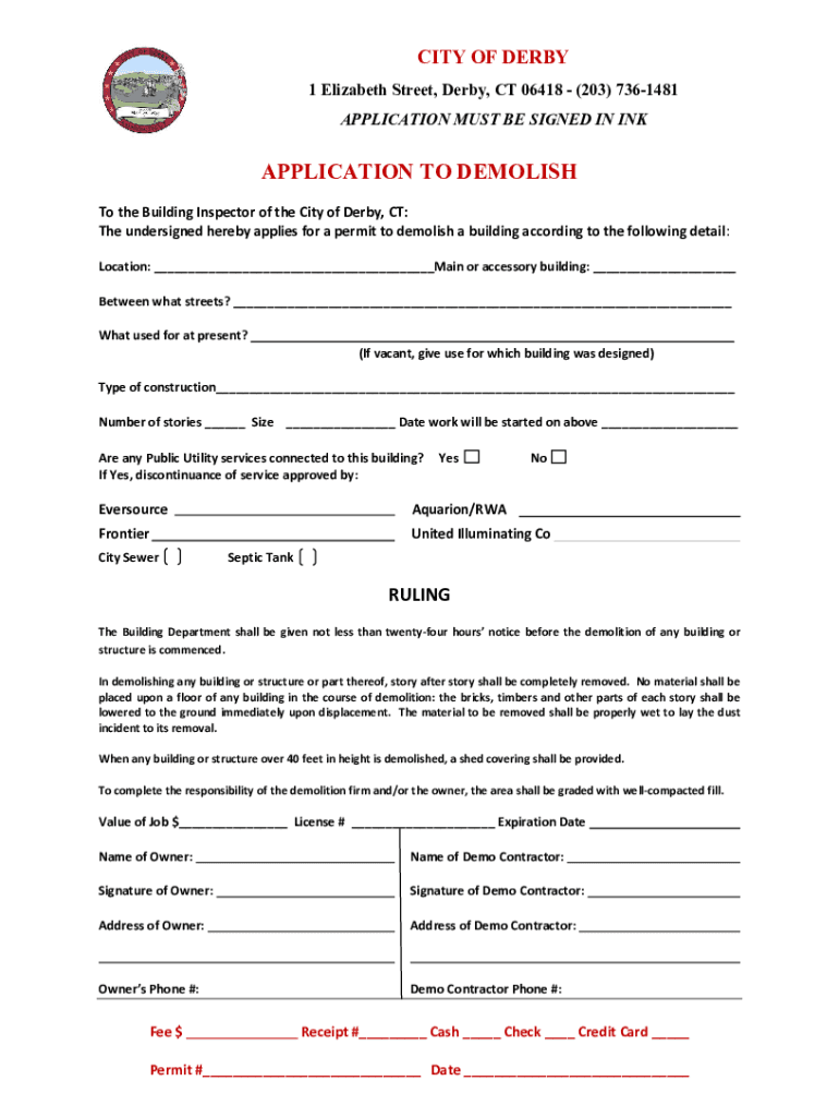 CITY OF DERBY 1 Elizabeth Street, Derby, CT 06418 (203) 7361481 APPLICATION MUST BE SIGNED IN APPLICATION TO DEMOLISH To the Building Inspector of the City of Derby, CT: The undersigned hereby applies