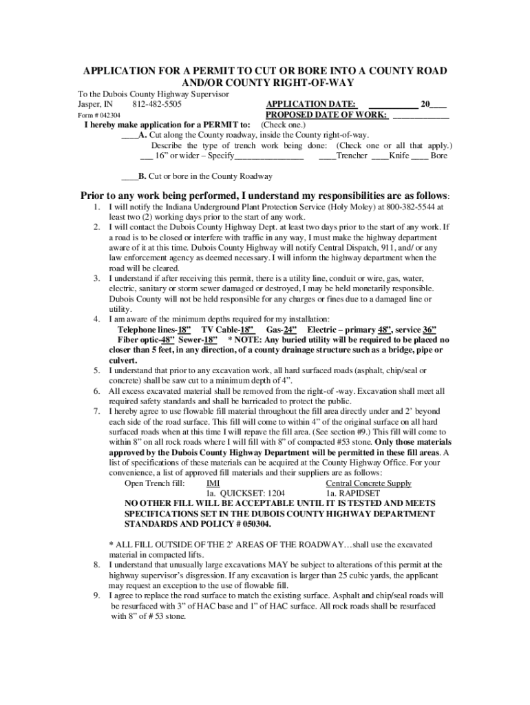 APPLICATION FOR A PERMIT TO CUT OR BORE INTO A COUNTY ROAD AND/OR COUNTY RIGHTOFWAY To the Dubois County Highway Supervisor Jasper, IN 8124825505APPLICATION DATE: 20___ PROPOSED DATE OF WORK: ___