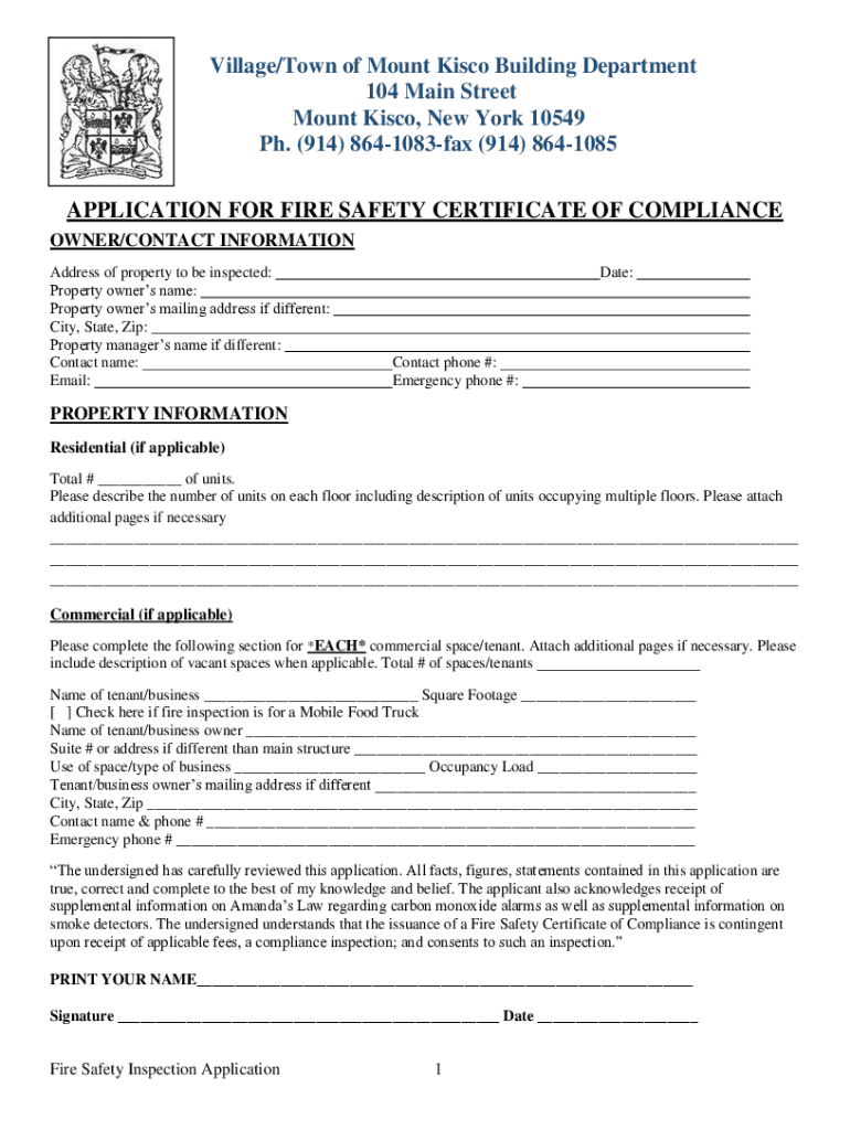 Village/Town of Mount Disco Building Department 104 Main Street Mount Disco, New York 10549 pH. (914) 8641083fax (914) 8641085 APPLICATION FOR FIRE SAFETY CERTIFICATE OF COMPLIANCE OWNER/CONTACT INFORMATION