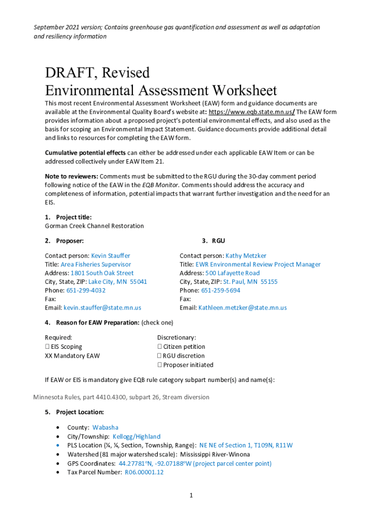 September 2021 version; Contains greenhouse gas quantification and assessment as well as adaptation and resiliency informationDRAFT, Revised Environmental Assessment Worksheets most recent Environmental
