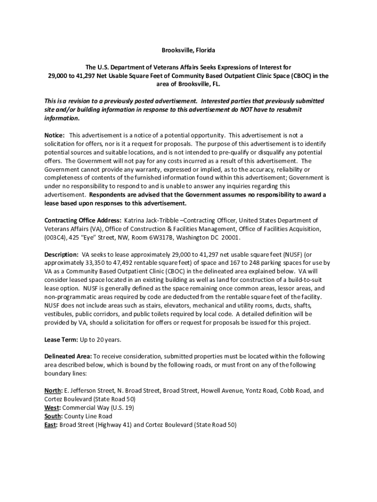 Brookville, Florida The U.S. Department of Veterans Affairs Seeks Expressions of Interest for 29,000 to 41,297 Net Usable Square Feet of Community Based Outpatient Clinic Space (CBC) in the area of