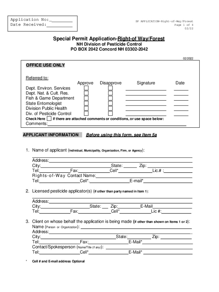 Application No:_ Date Received:SP APPLICATIONRightofWay/Forest Page 1 of 4 02/22Special Permit ApplicationRightof Way/Forest NH Division of Pesticide Control PO BOX 2042 Concord NH 033022042 02/2022OFFICE