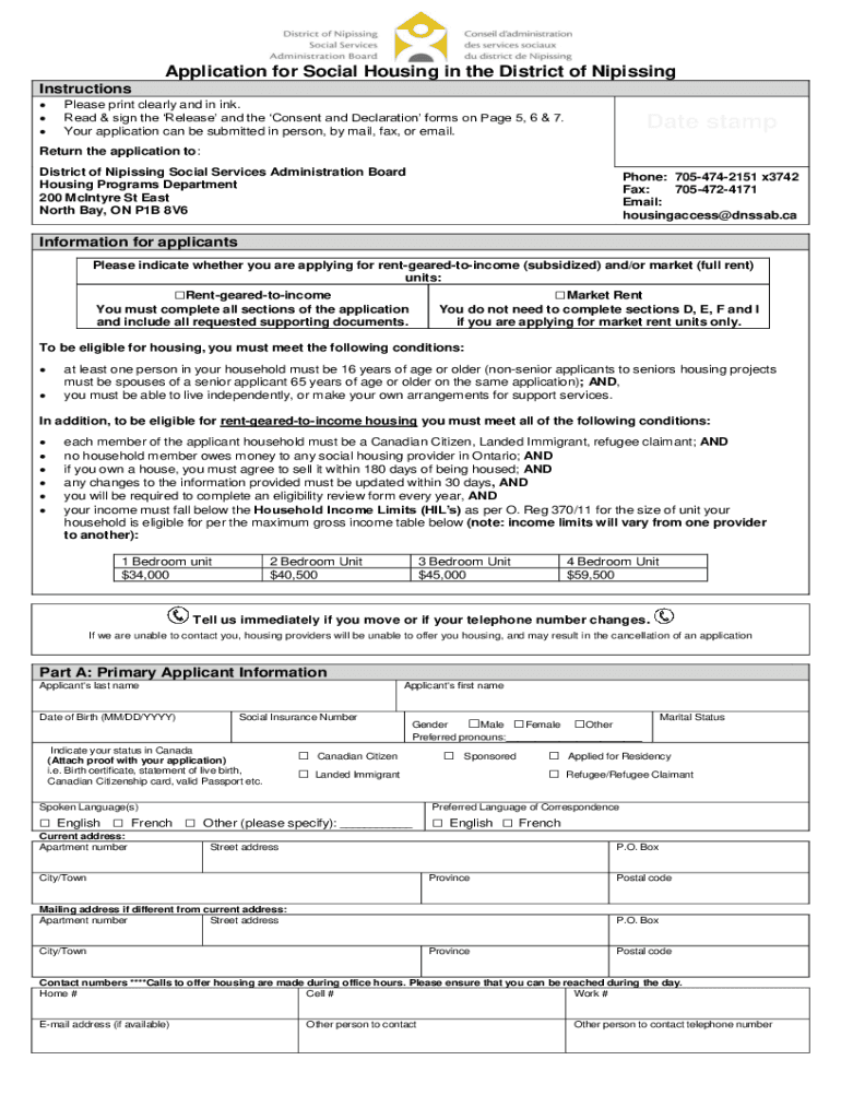 Application for Social Housing in the District of Ni pissing Instructions Please print clearly and in ink. Read & sign the Release and the Consent and Declaration forms on Page 5, 6 & 7. Your application