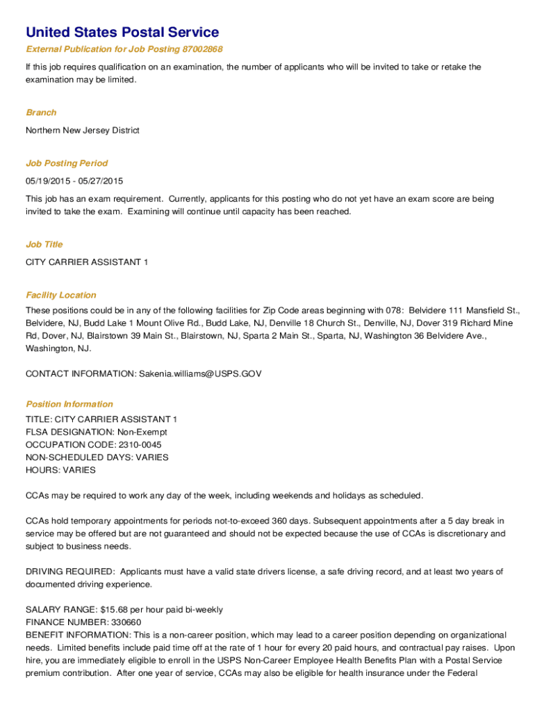 United States Postal Service External Publication for Job Posting 87002868 If this job requires qualification on an examination, the number of applicants who will be invited to take or retake the