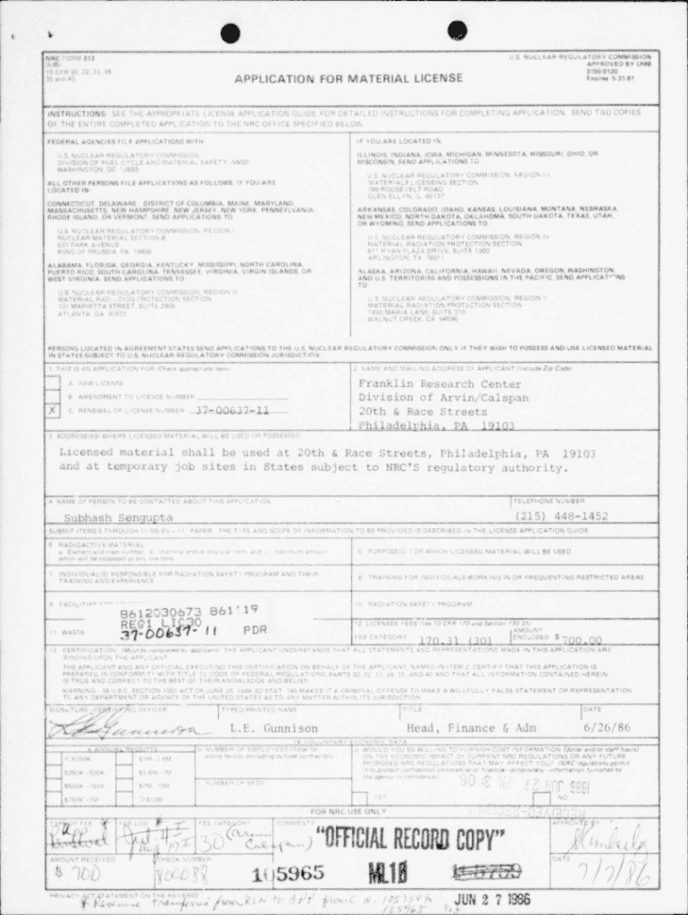 So, U S NUCLEI AR REGULATORY COMMISSION APPROVED 8Y OM8 3150 0120NOC FORM 313 91Eisto CFR 30,32,3134APPLICATION FOR MATERIAL LICENSE ha AOE PS 3: instructions SEE THE Approval. LATE LICENSE Application