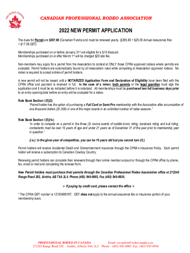 CANADIAN PROFESSIONAL RODEO ASSOCIATION2022 NEW PERMIT APPLICATION The dues for Permit are $397.88 (Canadian Funds) and must be renewed yearly. ($355.80 + $25.00 Annual Assurance Fee + $17.08 GST)