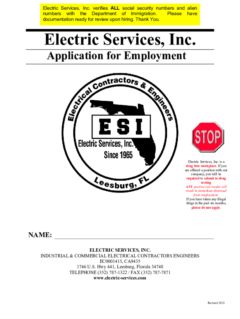 Electric Services, Inc. verifies ALL social security numbers and alien numbers with the Department of Immigration. Please have documentation ready for review upon hiring. Thank You. Electric Services,
